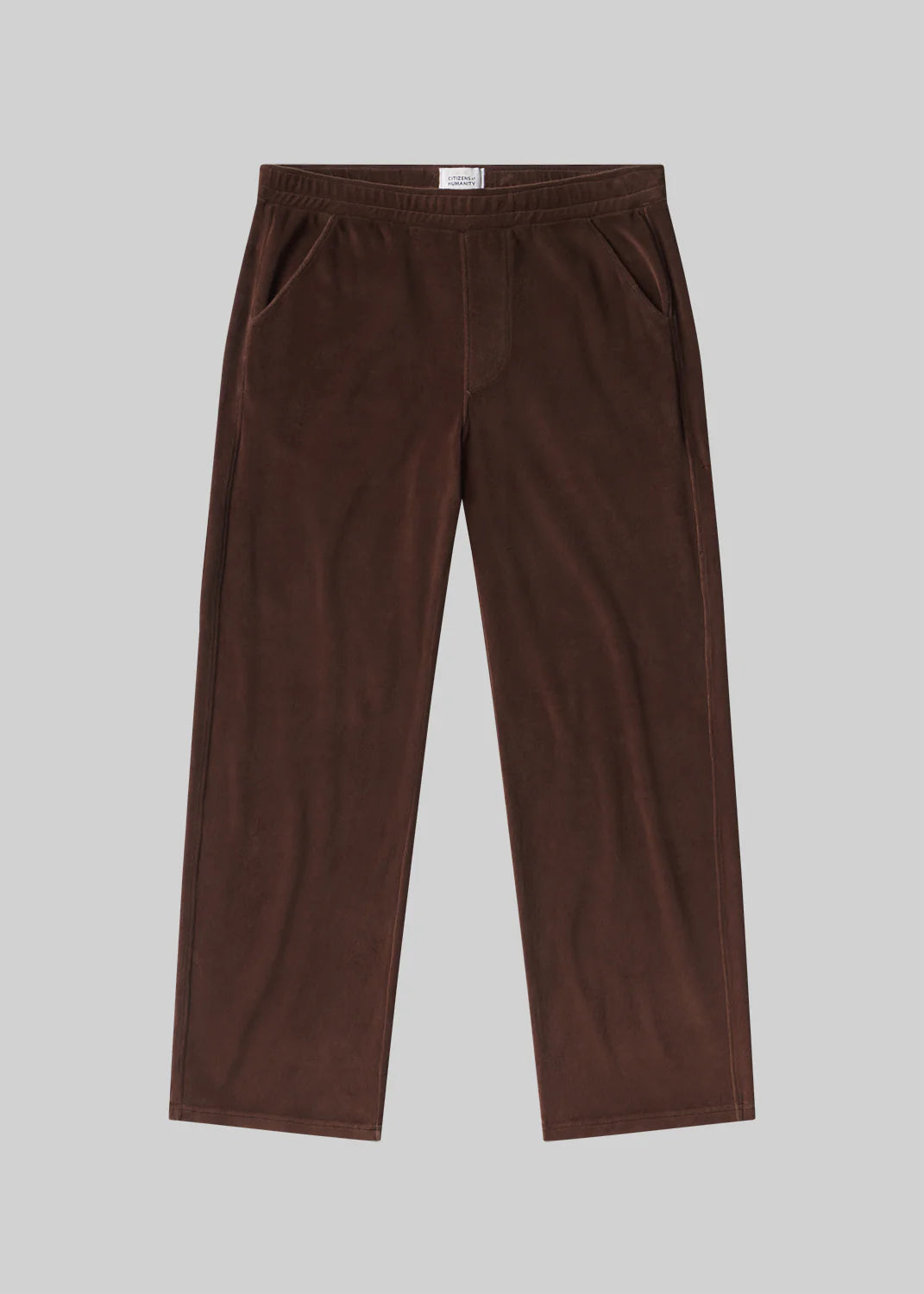 The Brynn pant offers a luxe take on off-duty comfort, cut in plush velour with a smooth, gentle feel. Designed with a high rise and full-length leg, the relaxed silhouette is finished with a tonal drawstring waistband for a laid-back yet elevated look. The rich Cammello shade—a dark, warm brown—adds depth and softness to the styling.
