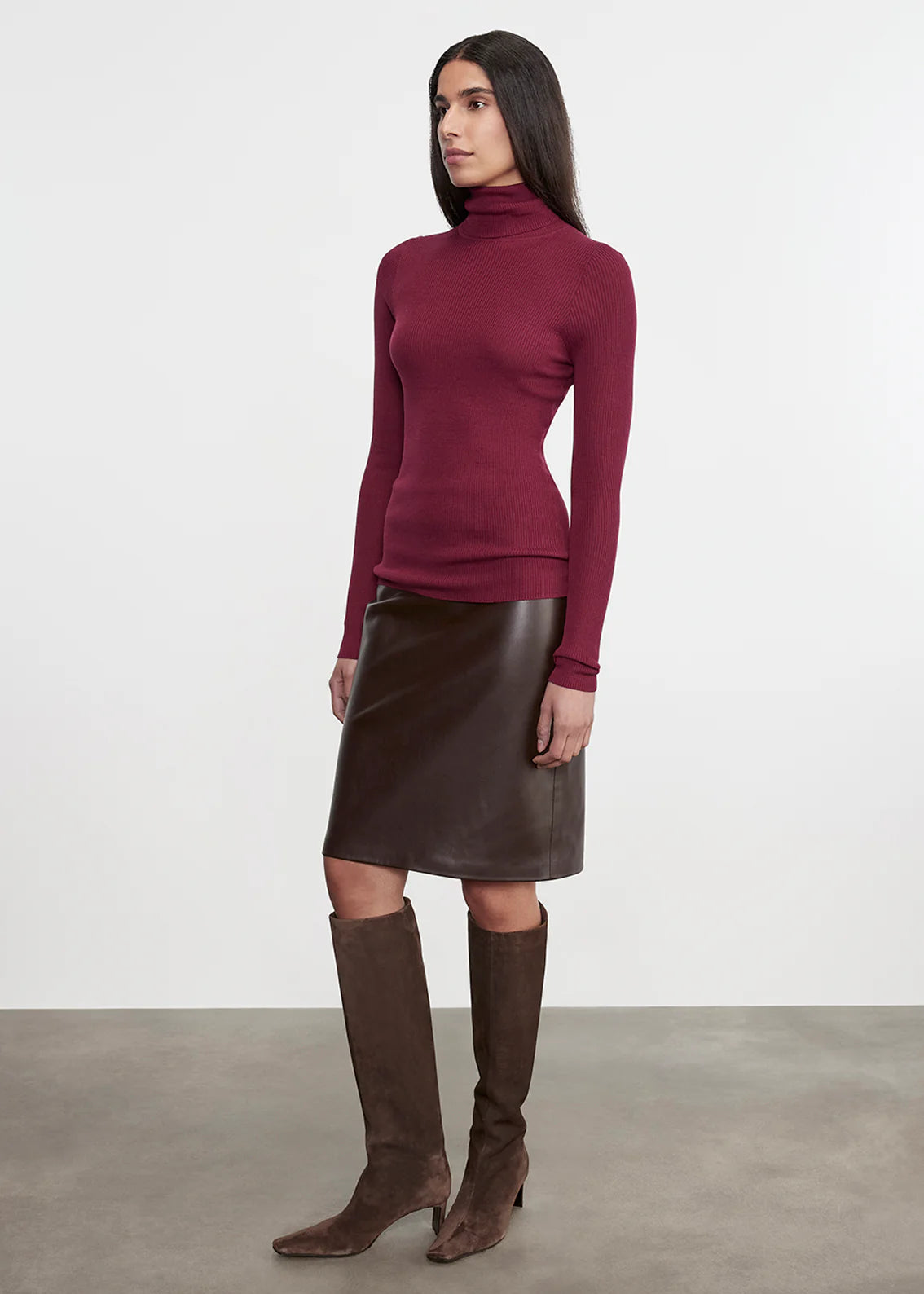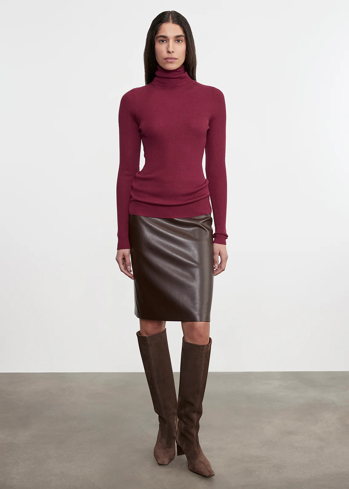 Pencil skirt in luxe stretch vegan leather. Slim fit with a clean waistband, knee length, and a concealed back zipper closure.