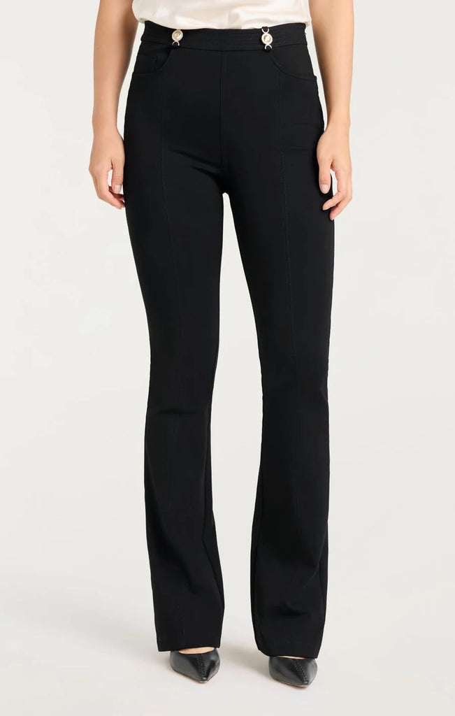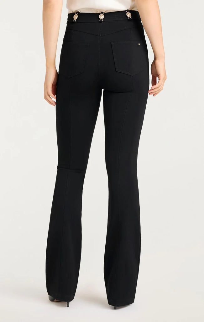 The Ponte Devin Pant features a sleek, black fitted design that hugs the silhouette, complemented by flared bottoms for a balanced, tailored look. The waistband is detailed with gold embellishments, adding a touch of luxury to this sophisticated wardrobe staple.