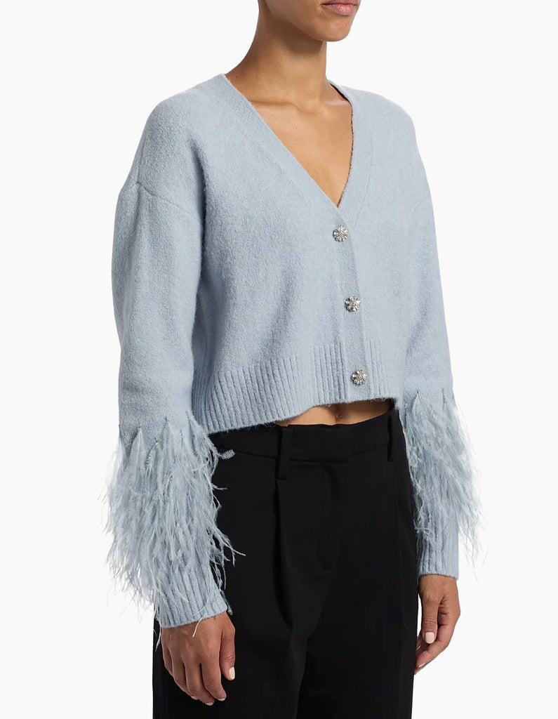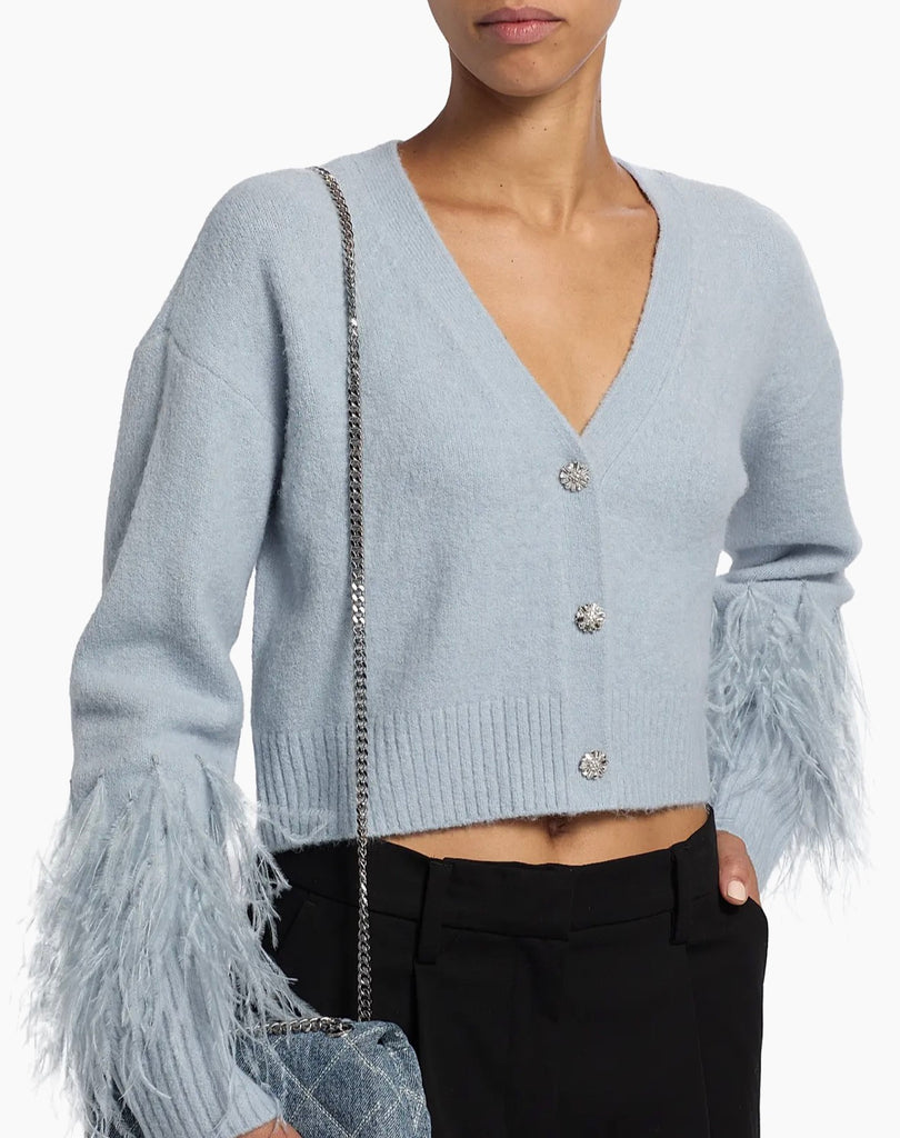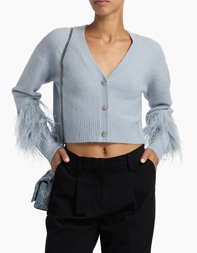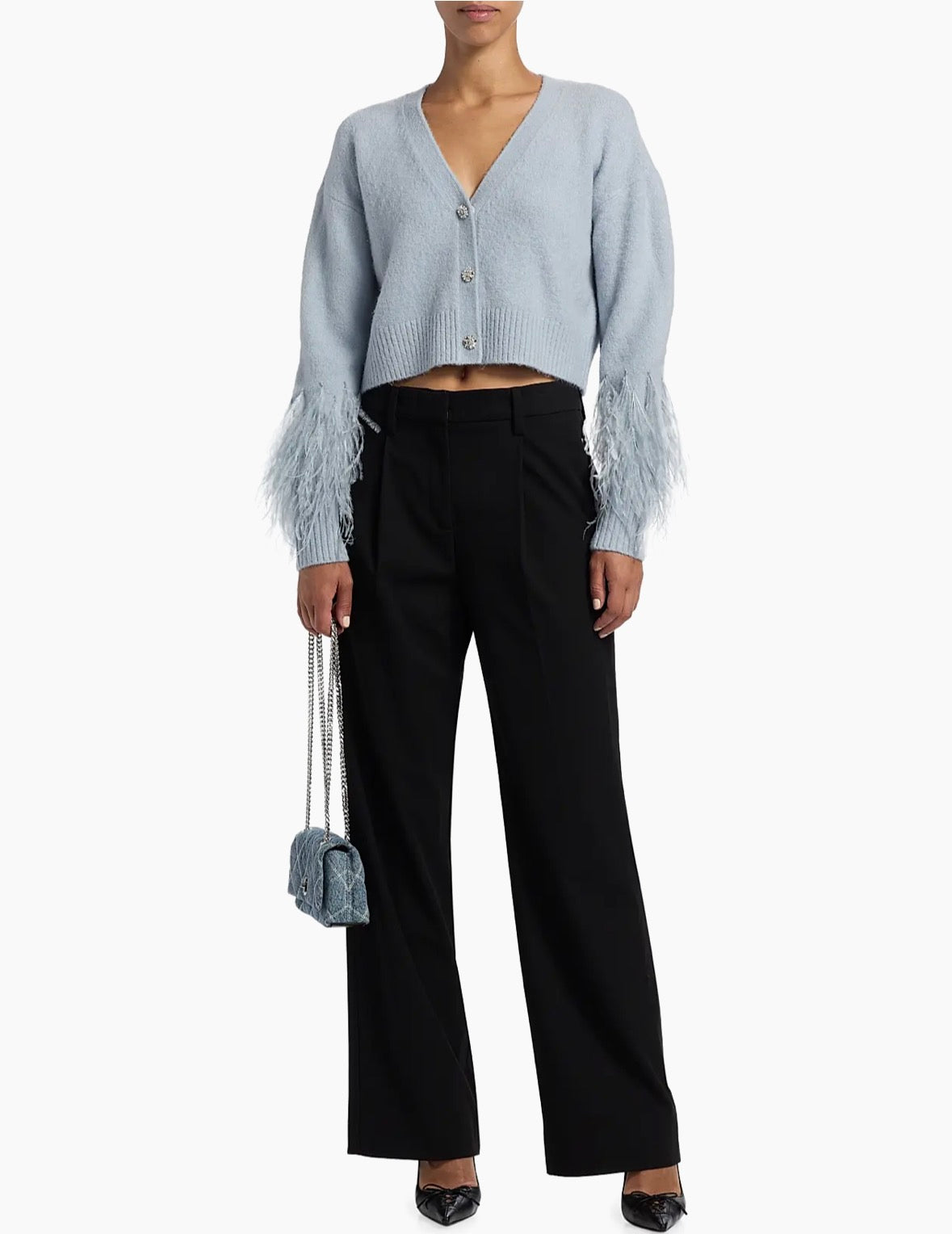 Cinq à Sept’s cozy Bria V-neck cardigan is styled with rib-knit and feather trim at the cuffs.