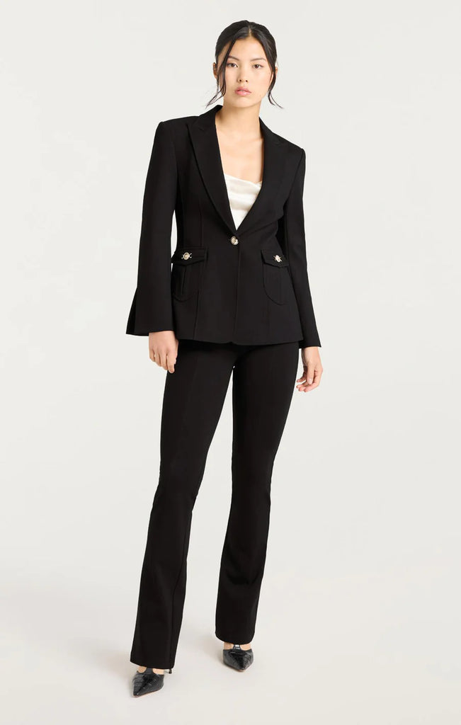 The Sable Blazer offers a timeless black silhouette tailored to flatter your waist with a sleek taper. Featuring subtle slit sleeves and minimal silver button accents, this blazer combines classic elegance with opulent details, that will make this easy to layer with any look.