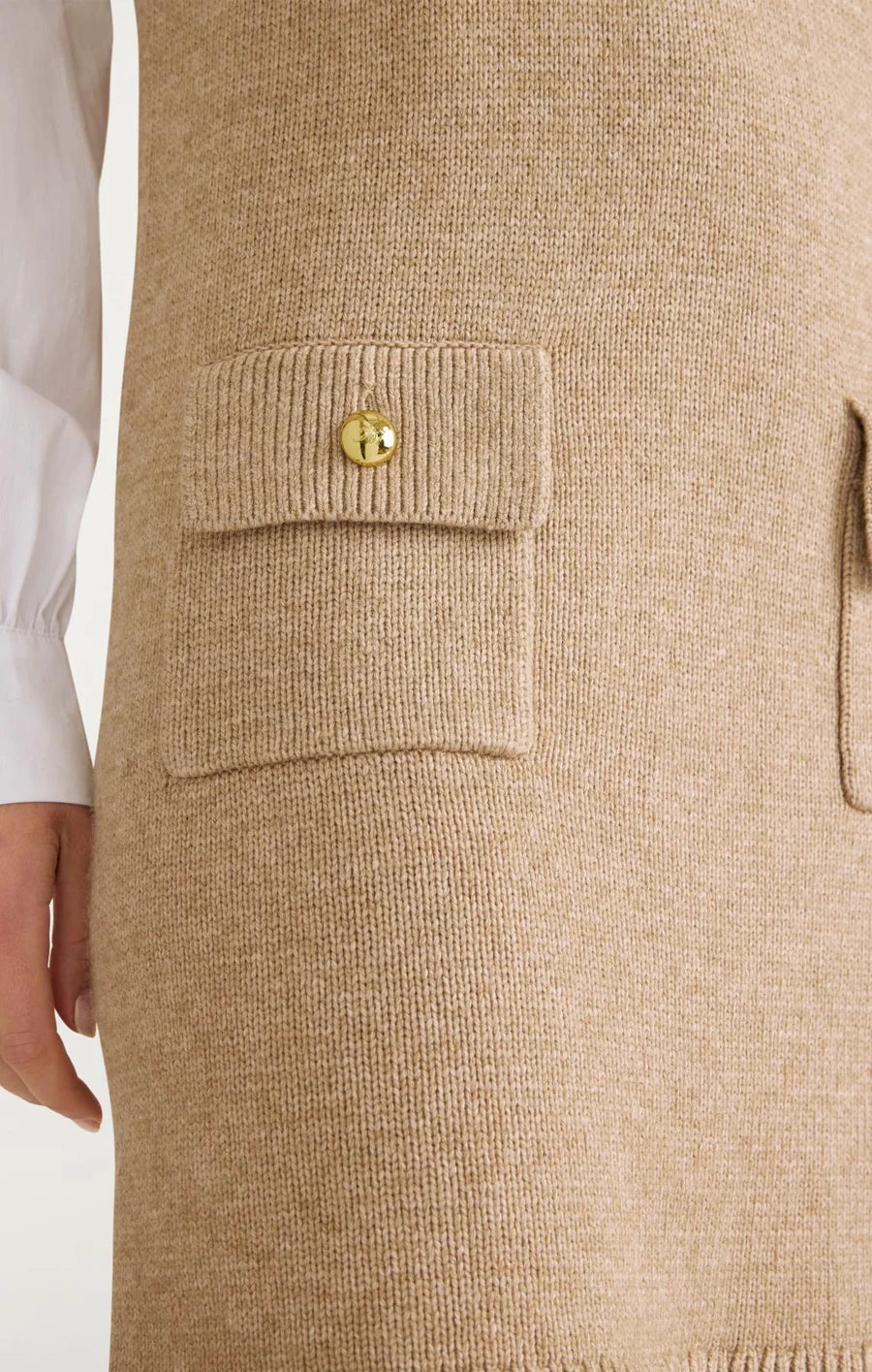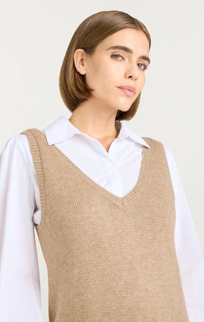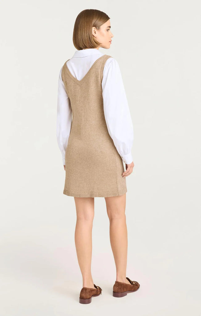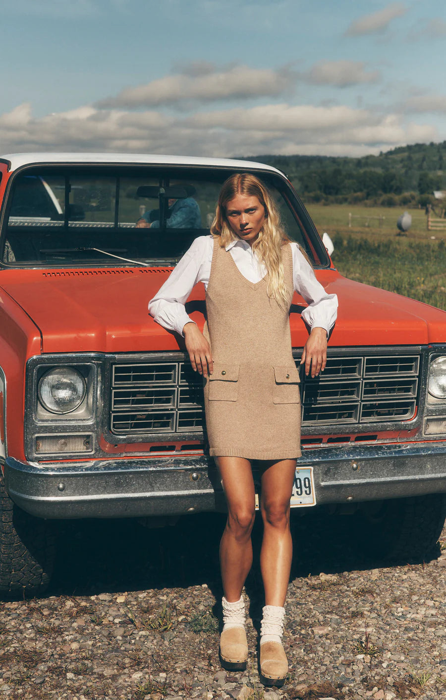 The Vivianne Dress simplifies your fall wardrobe with its pre-styled design: a long-sleeved white collared shirt paired with a mini knit dress. Featuring charming front pocket details, this stylish, seasonal piece makes putting together a polished outfit effortless.