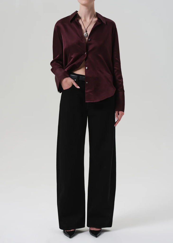 Looks Like: Deep dark red with purple undertones long sleeve button front blouse