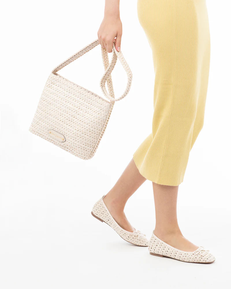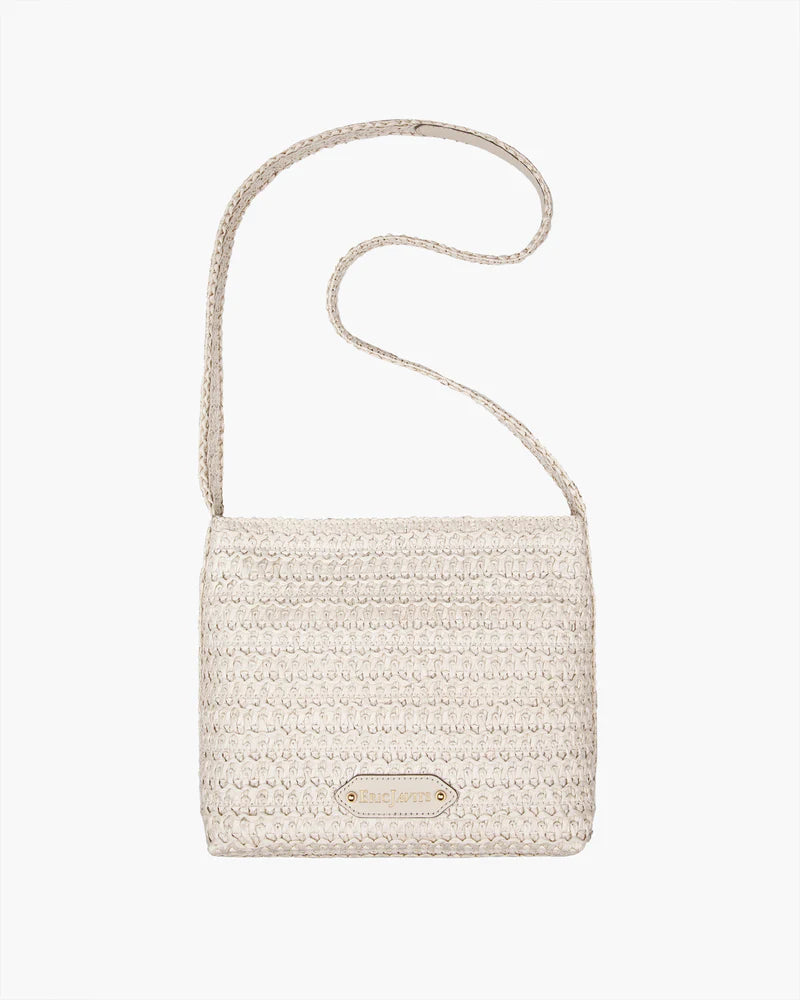 The textured weave is intricate with its long strap extending down the sides of the bag body. The mid-size rectangular shape is soft and squishy and feels body friendly. A roomy outer pocket on reverse is for easy access to phone or glasses.