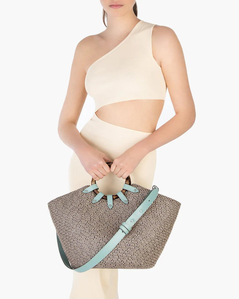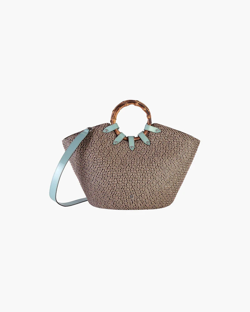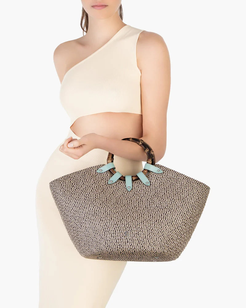 This large, (but still elegant) boat-shaped designer tote for sale, made of leather-trimmed Squishee®, features dual bamboo ring short handles, a draw-string pouch top closure, and a detachable leather strap that easily adjusts from shoulder to cross-body length. Other features include protective bottom feet, and a convenient outer patch pocket for easy access to phone, sunglasses, and passport.