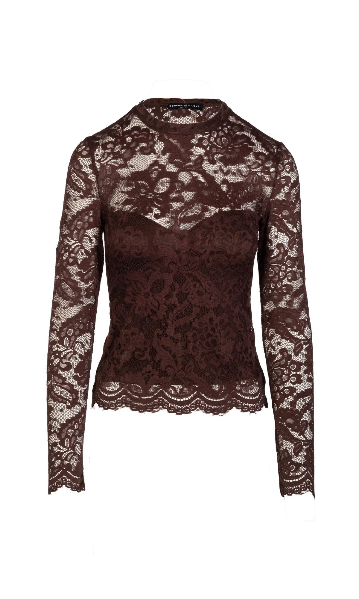 The Clayton Lace Top is a sophisticated layering piece with timeless appeal. Crafted from floral stretch lace in rich brown, it features a mock neckline, sheer long sleeves, and a sweetheart-lined bodice for subtle coverage. Perfect on its own for a sultry evening look or layered under blazers and jackets for day-to-night versatility.