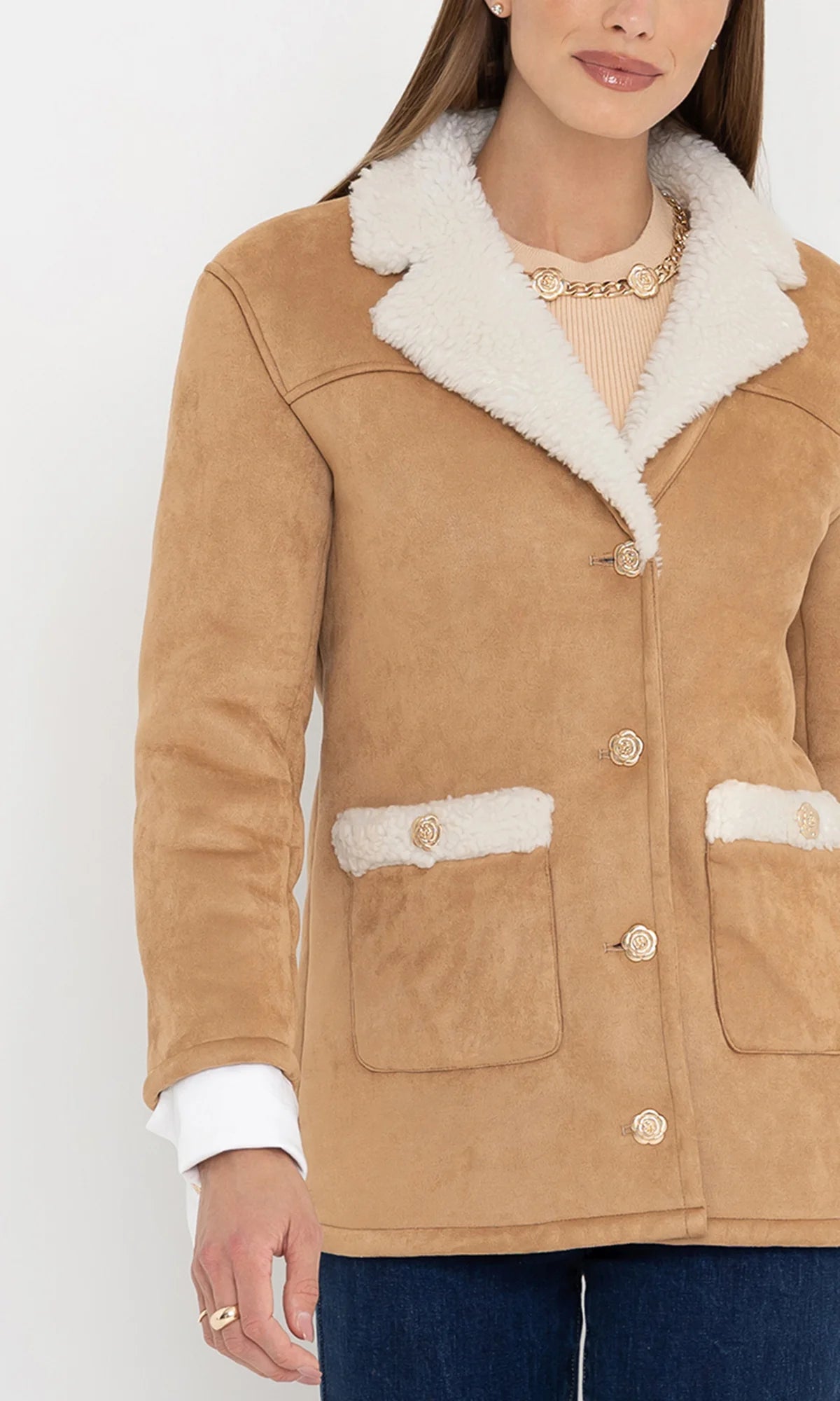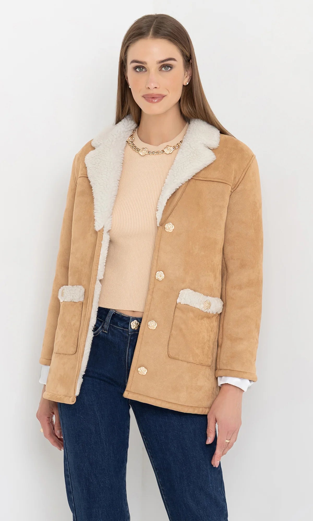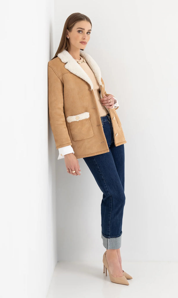 Classic meets cozy in the Luvia Jacket. This mid-length style is crafted from plush faux shearling with a cork-toned vegan suede exterior and soft ivory lining. Oversized patch pockets and floral buttons offer both function and charm, while the relaxed fit makes it perfect for layering. Toss it over denim, knits, or dresses for an effortlessly warm and stylish finish.