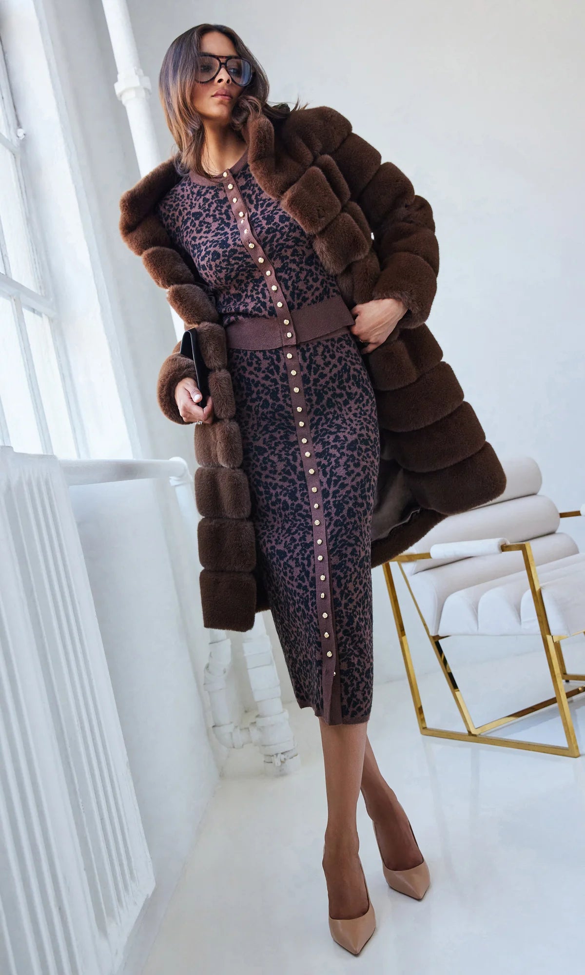 Bring bold texture to your fall layers with the Tulum Cardigan. Featuring a rich brown and black leopard jacquard knit, this crewneck button-down is accented with gold hardware and ribbed trim for a polished finish. Slightly cropped for a flattering, modern silhouette, it pairs effortlessly with denim, trousers, or the matching skirt. Wear it solo or layered — it’s a standout piece either way.