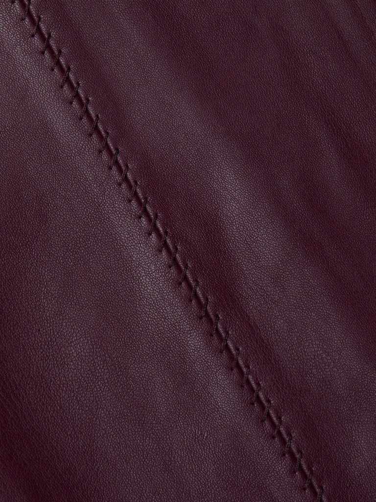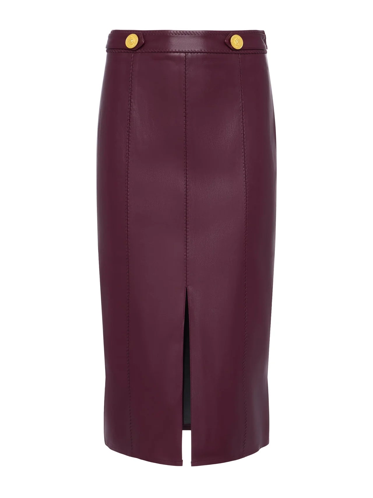 The Arlette debuted at our Fall ‘25 NYFW presentation. Sleek and sophisticated, this midi skirt is crafted from rich vegan leather in a deep maroon hue. Tonal whipstitch seaming and gold crest buttons lend a polished finish, while the front slit brings in the attitude. Pair it with a tucked-in blouse or sharp blazer for desk to drinks.