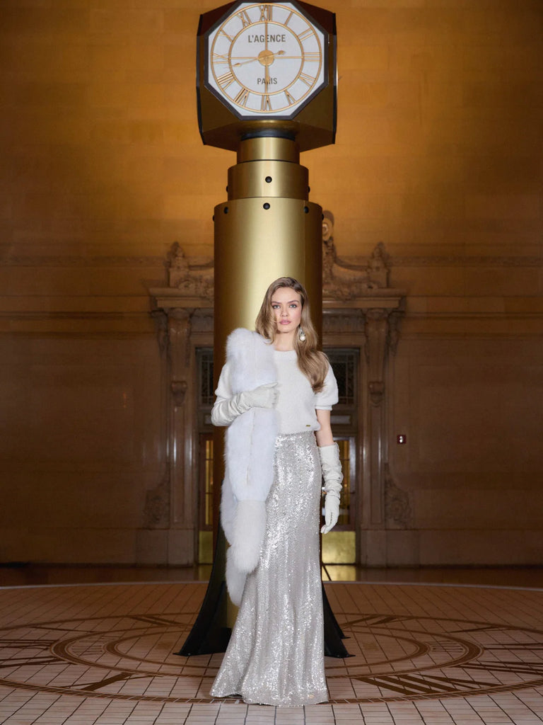 This style debuted at our Fall ‘25 NYFW presentation. The Guinevere is a luxe update to the classic crewneck sweater. Spun from an ultra-soft knit, it features a cropped silhouette with short sleeves that make it perfect for transitional wear. The plush texture lends a cozy yet refined feel, while its clean lines keep the look modern. Pair with sequined skirts for evening glamour, or style with high-waisted denim for an elevated off-duty ensemble.