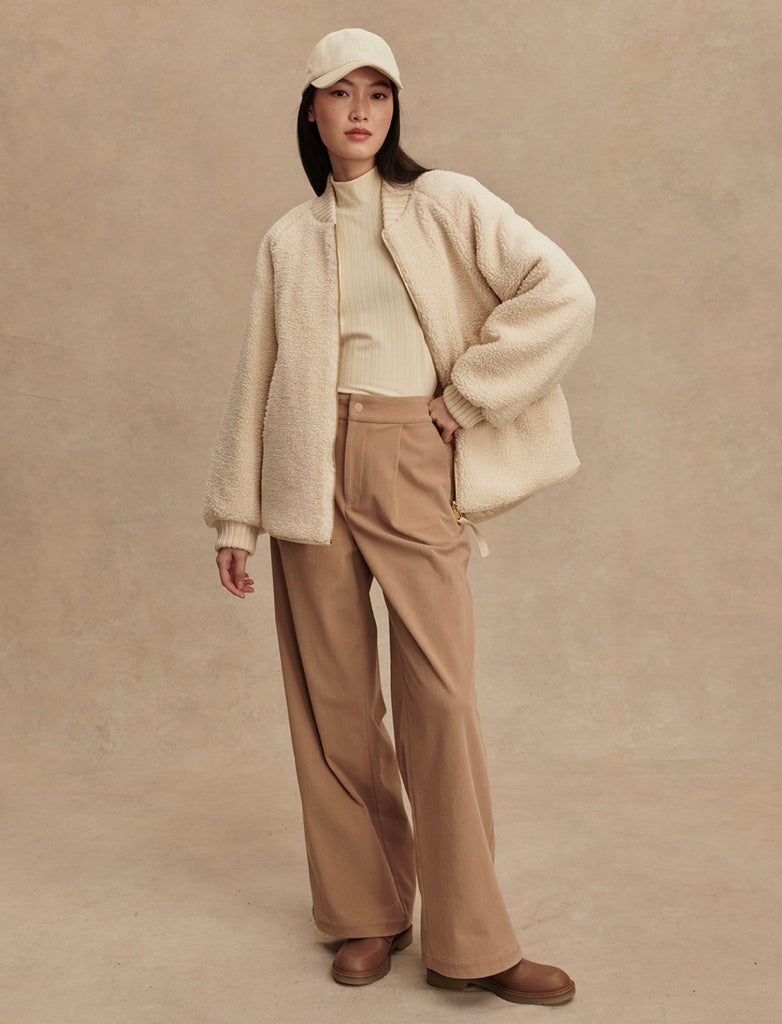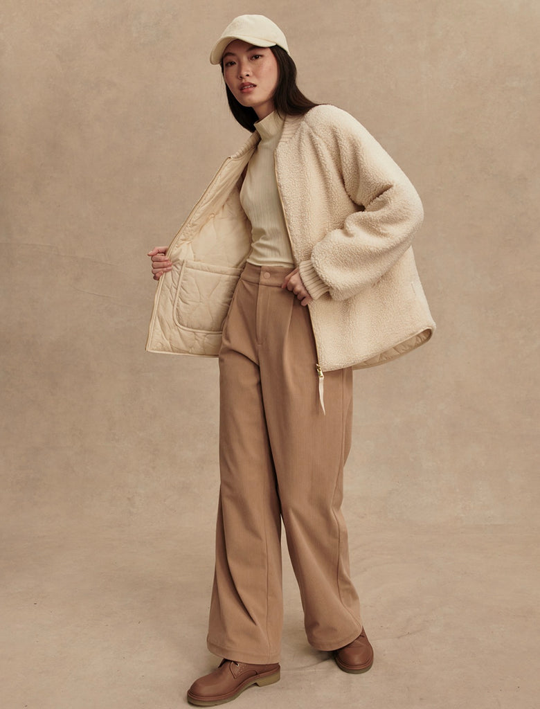 Customize your style with the reversible Serina. Soft, lightweight, and super versatile, it's perfect for effortless transitional and cold-weather layering. Made from a tight, curly Bouclé Sherpa on one side and our Crinkle Shell fabric in quilted design on the other, it's cut to a boxy bomber shape with a flattering curved hem. Complete with pockets and chunky knitted cuffs and collar.